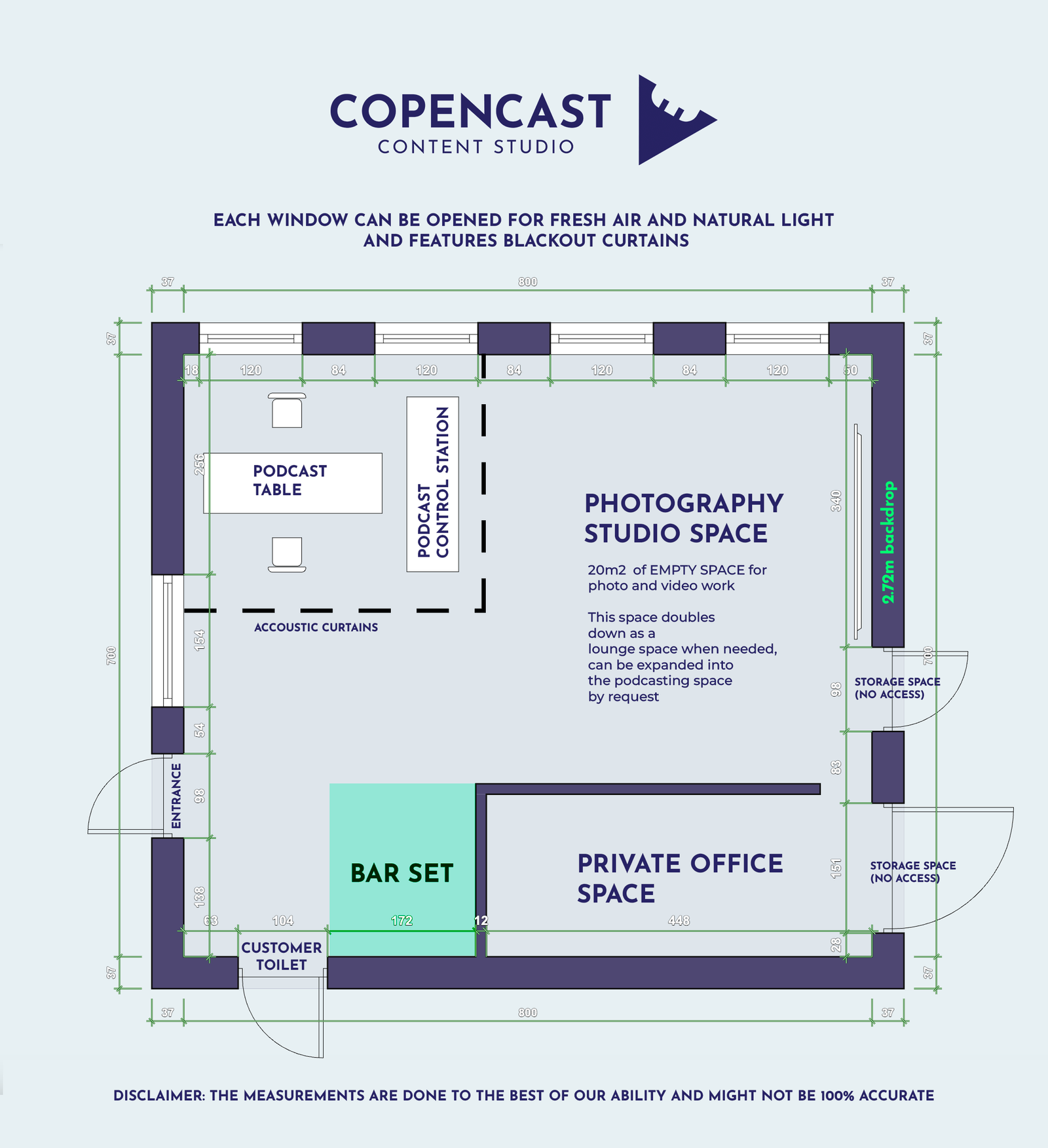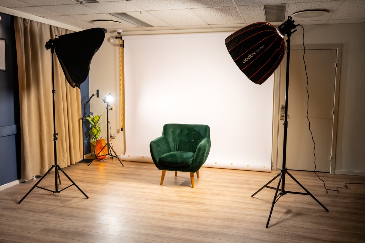 - Fotostudie : Vi tilbyder en 2,7 m bred baggrundsvæg med et effektivt, brugsklart tomt område på 20 m2 (ca. 4 m bredt x 5 m langt, men dette kan udvides i podcasthjørnet efter anmodning).